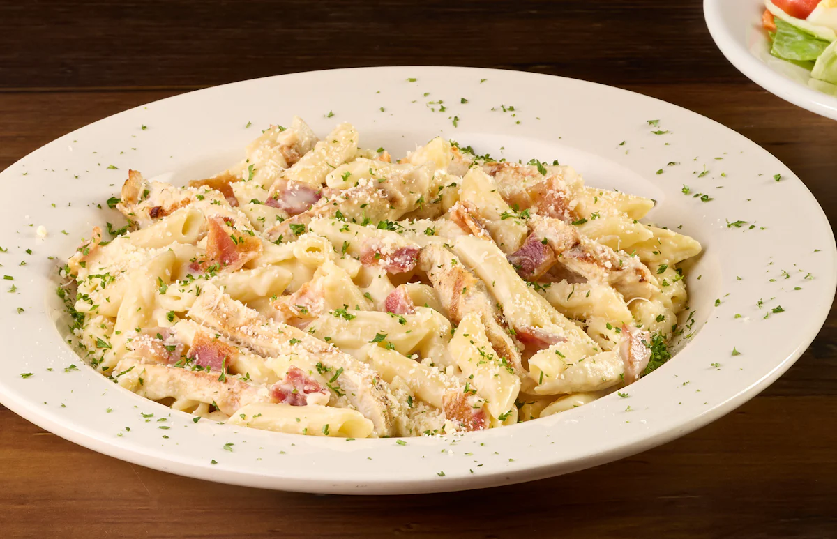 Classic chicken alfredo with grilled chicken, bacon, and a creamy Asiago cheese sauce served over penne pasta