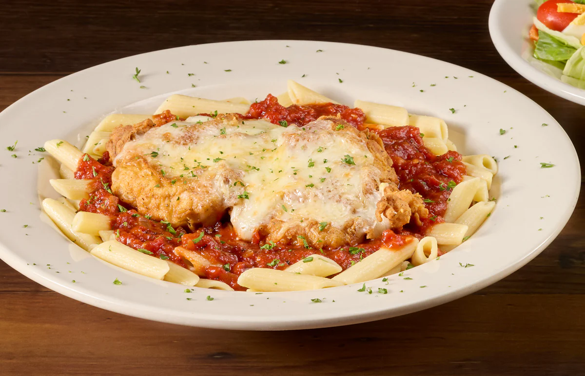 Penne pasta, scratch-made marinara, and a fried chicken breast with melted jack cheese and fresh Parmesan